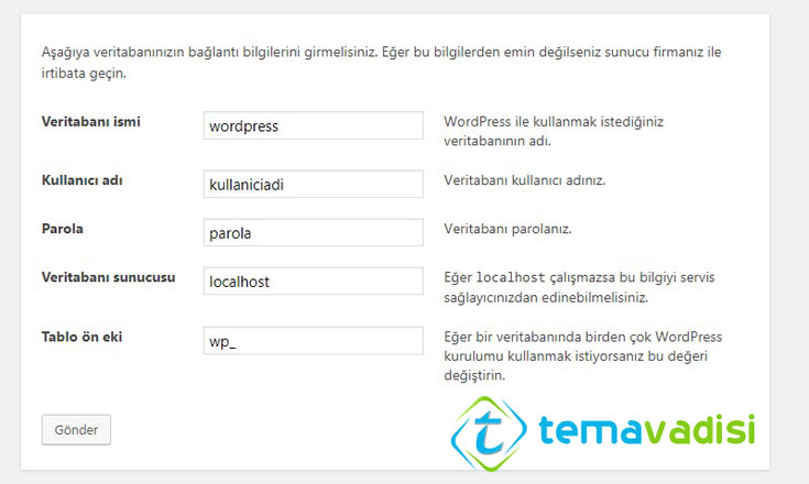 - Veritabanı sunucusu : Hosting firmanız aksini belirtmedikçe bu kısmı değiştirmeyin.